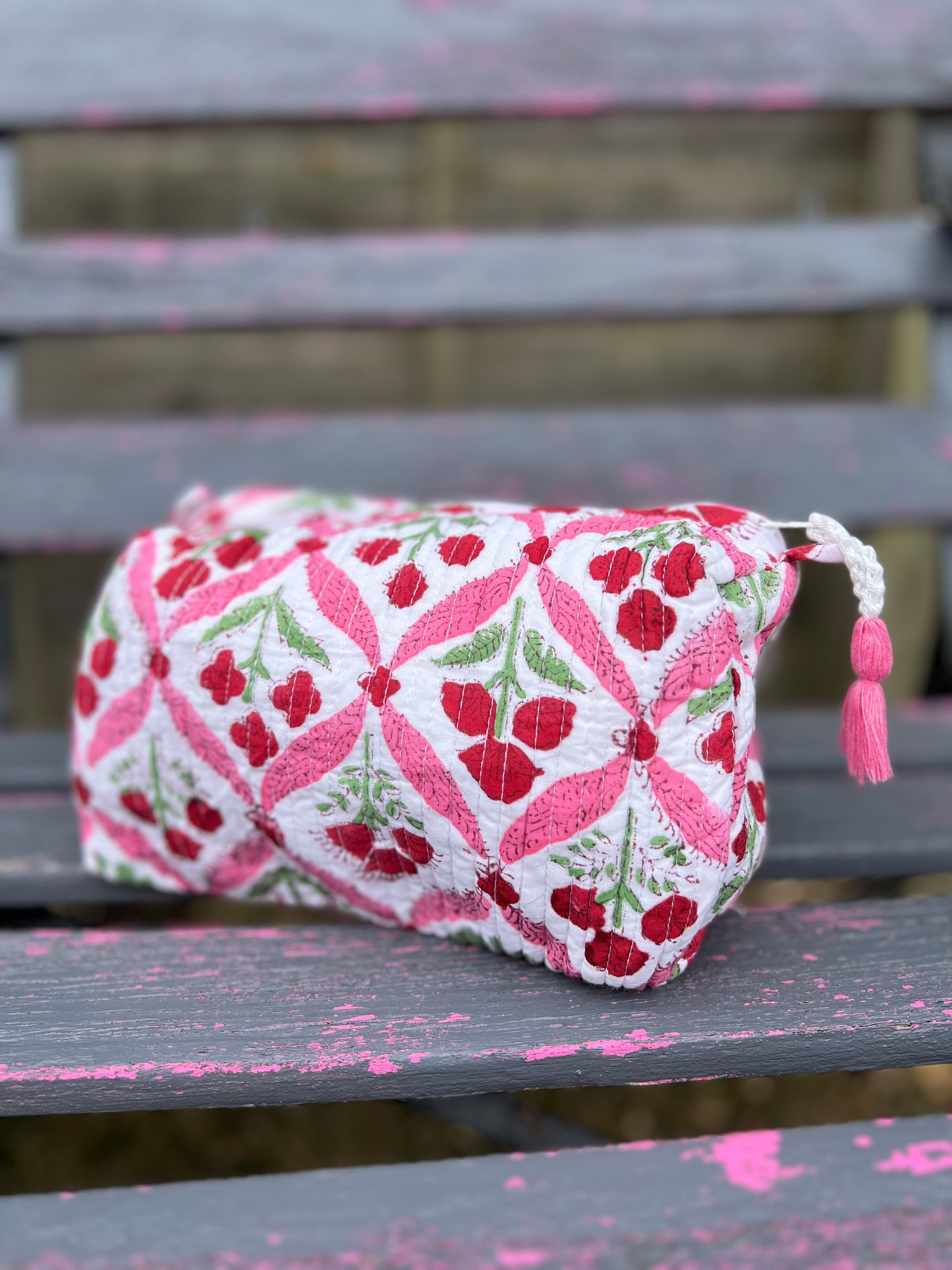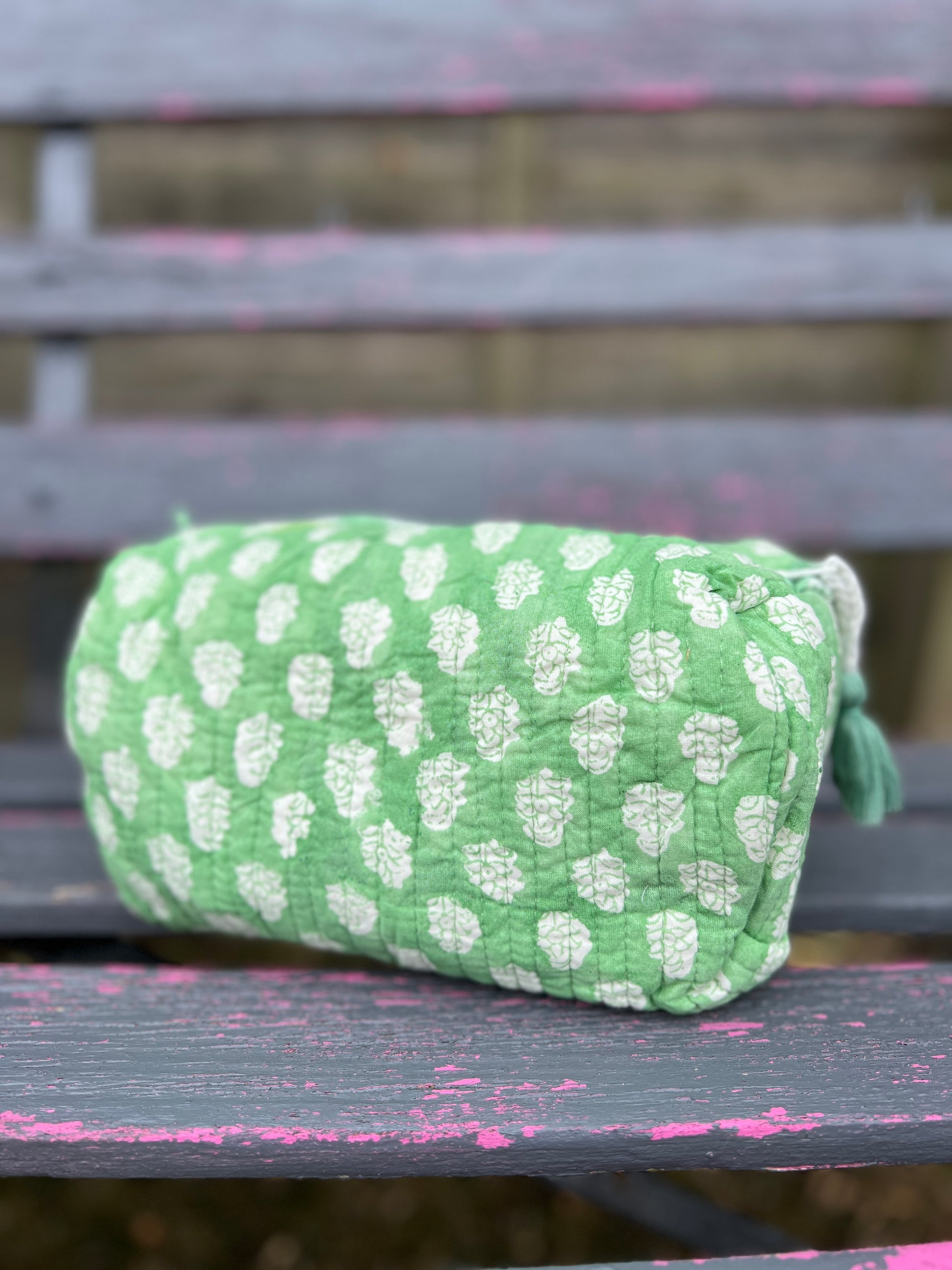 Handmade Block-Print Washbags from Jaipur, India. These fantastic medium size Washbags are the essential travel bag. Each bag designed and handmade using 100% cotton and waterproof lining, finished off with hand tied tassel.