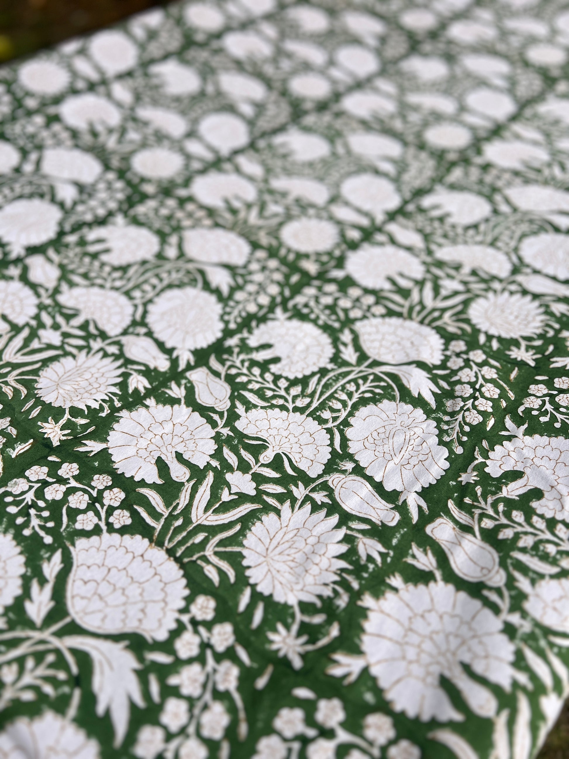 Indulge in the sophisticated elegance of our Forest Green Table Cloth. Handmade in Jaipur using sustainable, blockprint cotton fabric, it effortlessly adds luxury to any 6-8 seater table. Elevate your dining experience with this tasteful and exclusive piece.