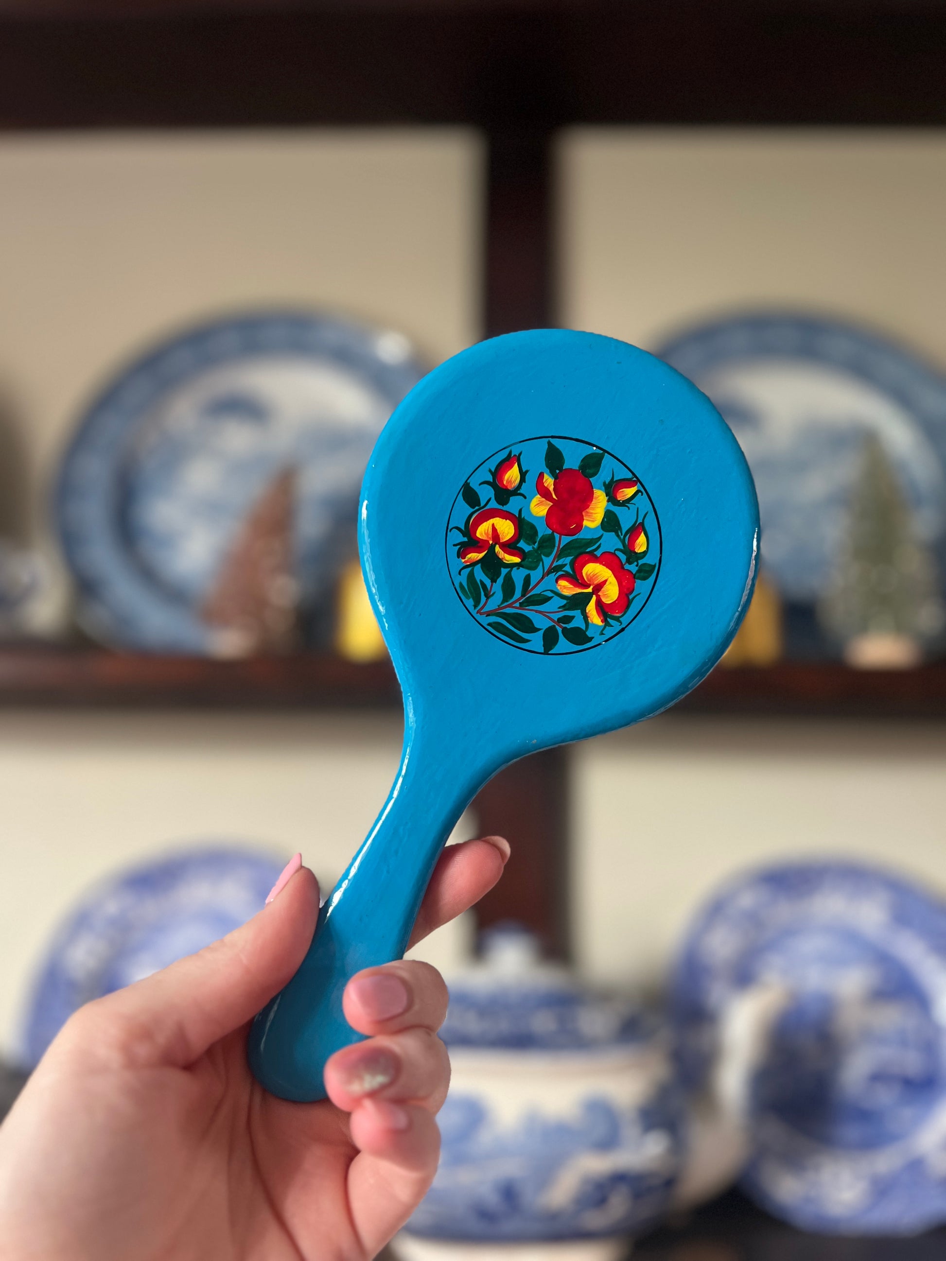 Handpainted in Kashmir, this wooden mirror boasts intricate floral details against a vibrant blue background. Handheld and perfect for travel, each purchase supports a small community of artisans. Add a touch of artistry and support a community with this Handpainted Wooden Mirror.
