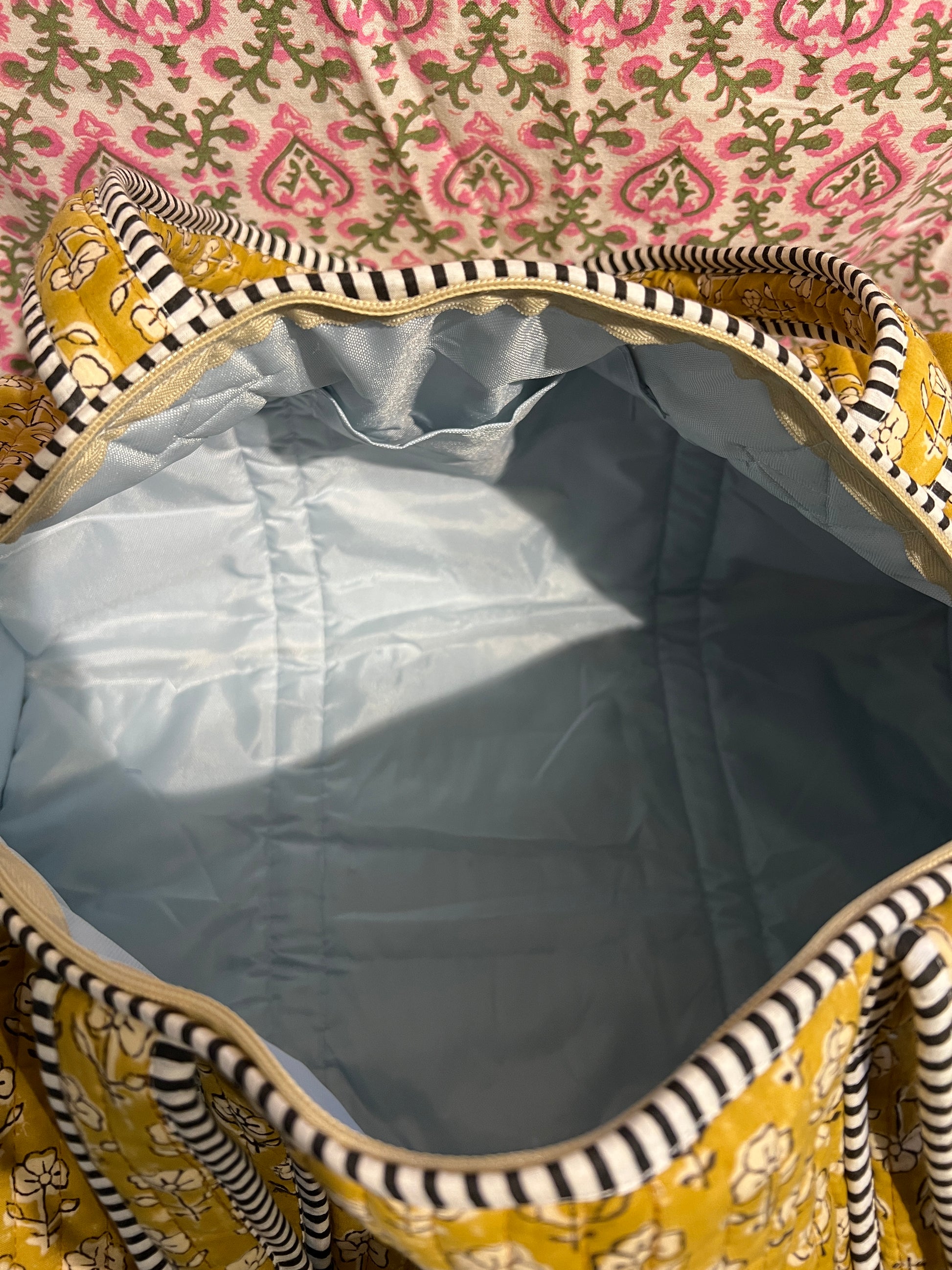 Crafted by skilled artisans in the enchanting city of Jaipur, the Mustard Weekend Bag embodies a harmonious blend of functionality and artistry. Adorned with exquisite blockprint cotton, its exterior boasts both elegance and resilience, while the wipeable waterproof lining ensures that your adventures remain unblemished. Thoughtfully designed with external zip pockets and a versatile multi-way zip, it invites exploration with an air of sophistication. Measuring 47 x 25 x 25cm, this bag is a testament to both luxury and practicality, destined to accompany you on your most cherished escapades.