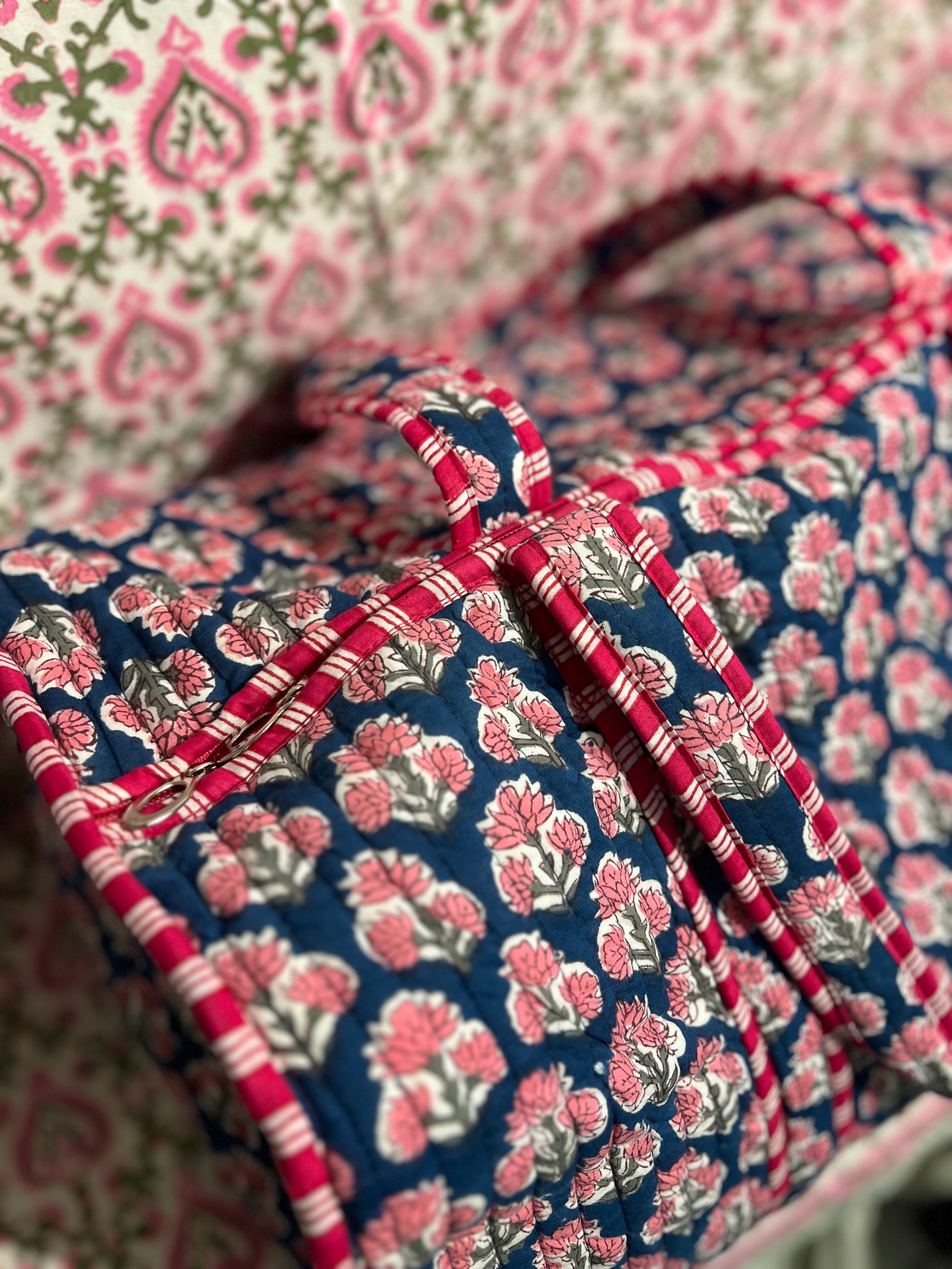 Crafted by skilled artisans in the enchanting city of Jaipur, the Navy Floral Weekend Bag embodies a harmonious blend of functionality and artistry. Adorned with exquisite blockprint cotton, its exterior boasts both elegance and resilience, while the wipeable waterproof lining ensures that your adventures remain unblemished. Thoughtfully designed with external zip pockets and a versatile multi-way zip, it invites exploration with an air of sophistication. Measuring 47 x 25 x 25cm, this bag is a testament to both luxury and practicality, destined to accompany you on your most cherished escapades.