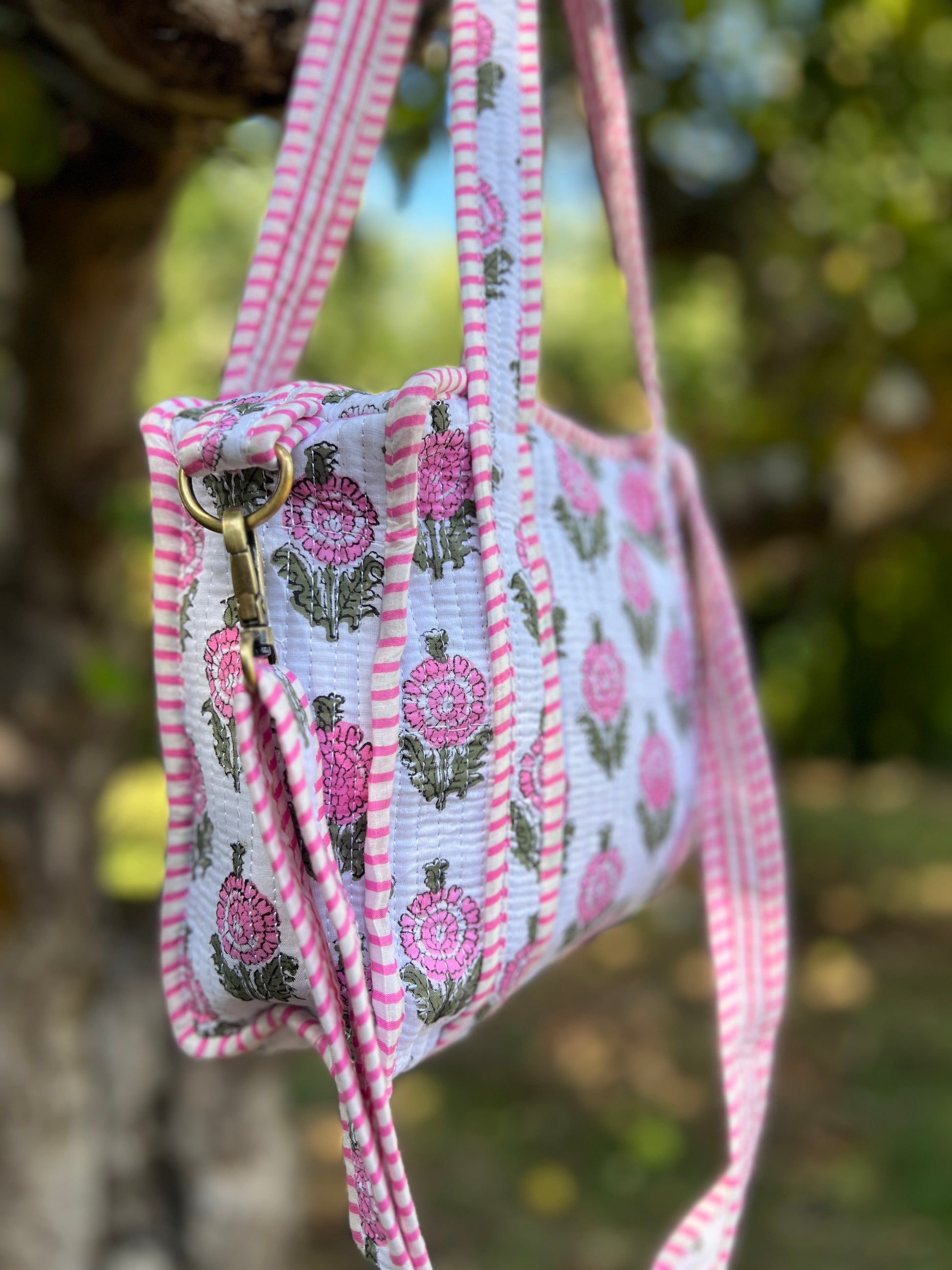 Indulge in the luxurious elegance of our Pink Floral Super Mini Tote. Handmade in Jaipur, this sophisticated tote features a detachable cross body strap and a secure zip closure. Carry your essentials in style and add a touch of glamour to any outfit.