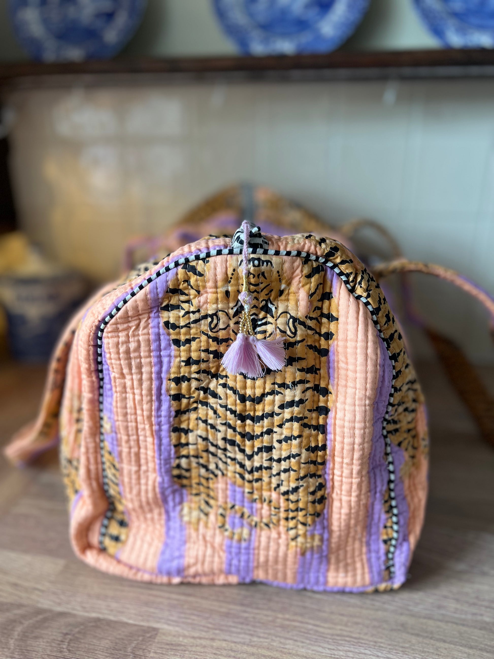 Indulge in the unique charm of our Tiger Stripe Blockprint Weekend Bag! Handcrafted with care and skill, this bag seamlessly combines versatile functionality with a stylish and durable design. Perfect for the Gym, travels or as an everyday bag. Each piece is lovingly handmade in Jaipur using high-quality cotton block print fabric,making it a must-have accessory for your weekend adventures.