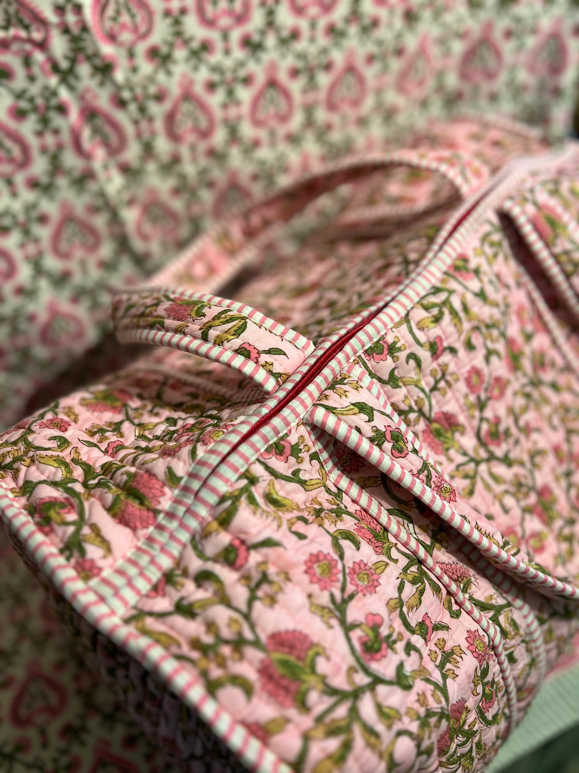 The Popping Pink Weekend Bag combines craftsmanship and sustainability, being handmade in Jaipur from eco-friendly blockprint fabric. Its features include zipped external pockets, waterproof wipeable interior and internal pocket.