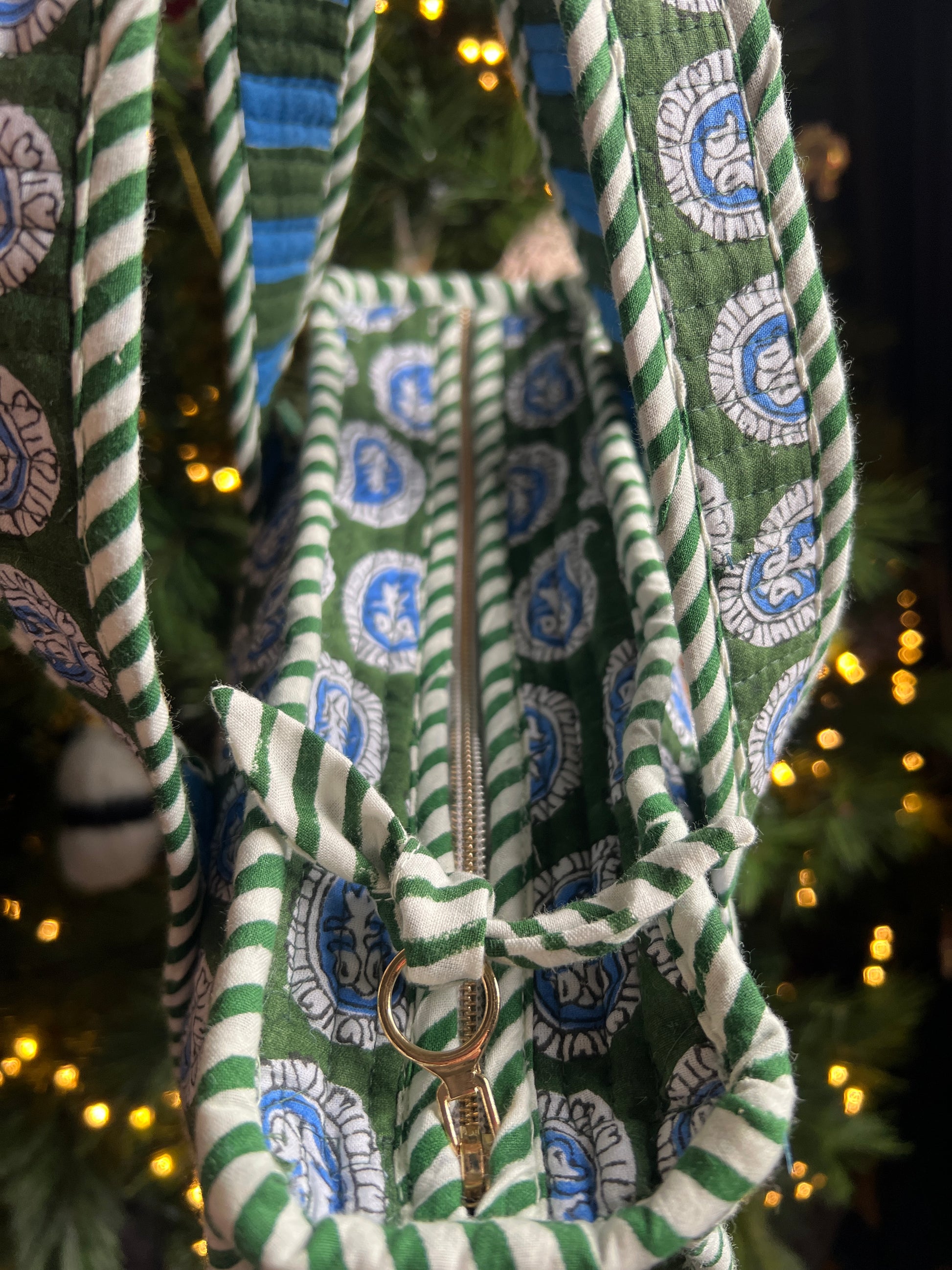 The Sapphire Paisley Super Mini Tote is a limited edition handbag, made of vibrant blockprint fabric. Its best selling design features a convenient crossbody strap and zip closure, making it a must-have for any occasion. Handmade in Jaipur, this bag combines style and functionality perfectly.